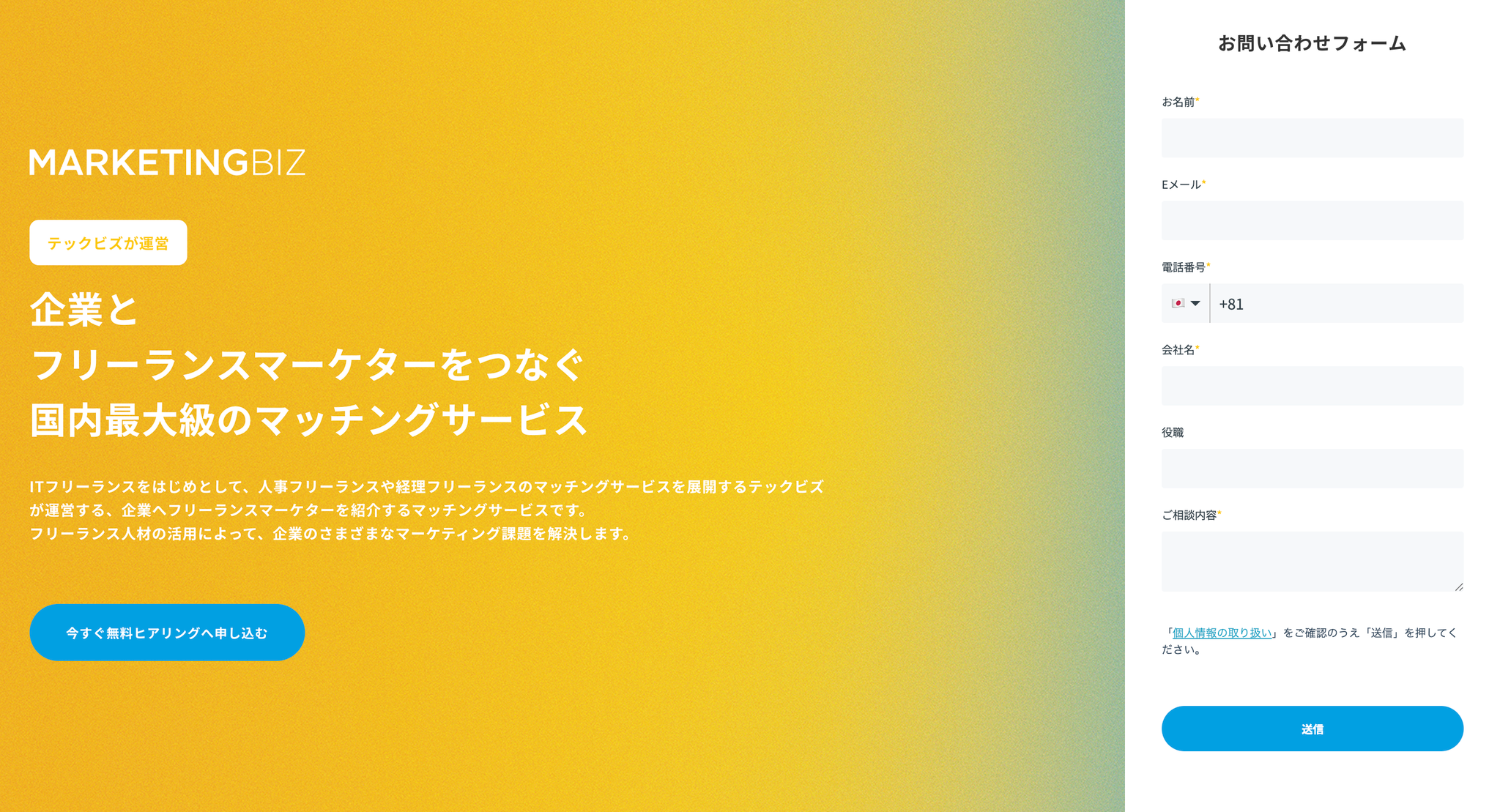 テックビズのマーケティング部は、フリーランスマッチング事業を基盤に、IT・HR・FINANCE・MARKETINGの4つのサービスを展開しています。
